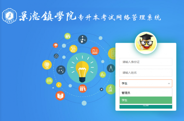 请各位考生登录景德镇学院专升本考试查询系统选择“学生”身份,输入身份证号码和姓名查询成绩及专业排名。